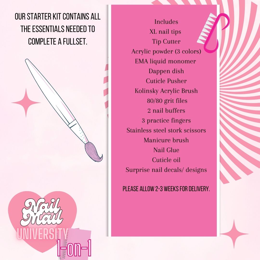 Welcome to Nail Mail University! If the online course isn't your speed and you're like me, the 1on1 course is perfect for you. Learn the essentials of doing manicures, acrylic nails and designs in a personal Setting through an extensive 1on1 course, you will receive hands on skills training from our instructor. Nail Mail's very own, Crysi who has been in the game for 6 years and has also completed 600 hours of manicuring school, becoming a graduate in 2022. Through consistent practice and revisiting your manual as you see fit, you will be ready to take the next steps in accepting clients and becoming one of the best techs around! This 2day 3 hour class for a total of 6 hours will include a take home kit, and a Certificate of Completion. Upon purchasing, I will reach out to you to schedule a time and day that works best with your schedule. If you prefer mornings, or evenings, you let me know! Students will also receive a digital copy of The Acrylic Masterclass for continued learning at home. Additionally, you now have a nail mentor for life.